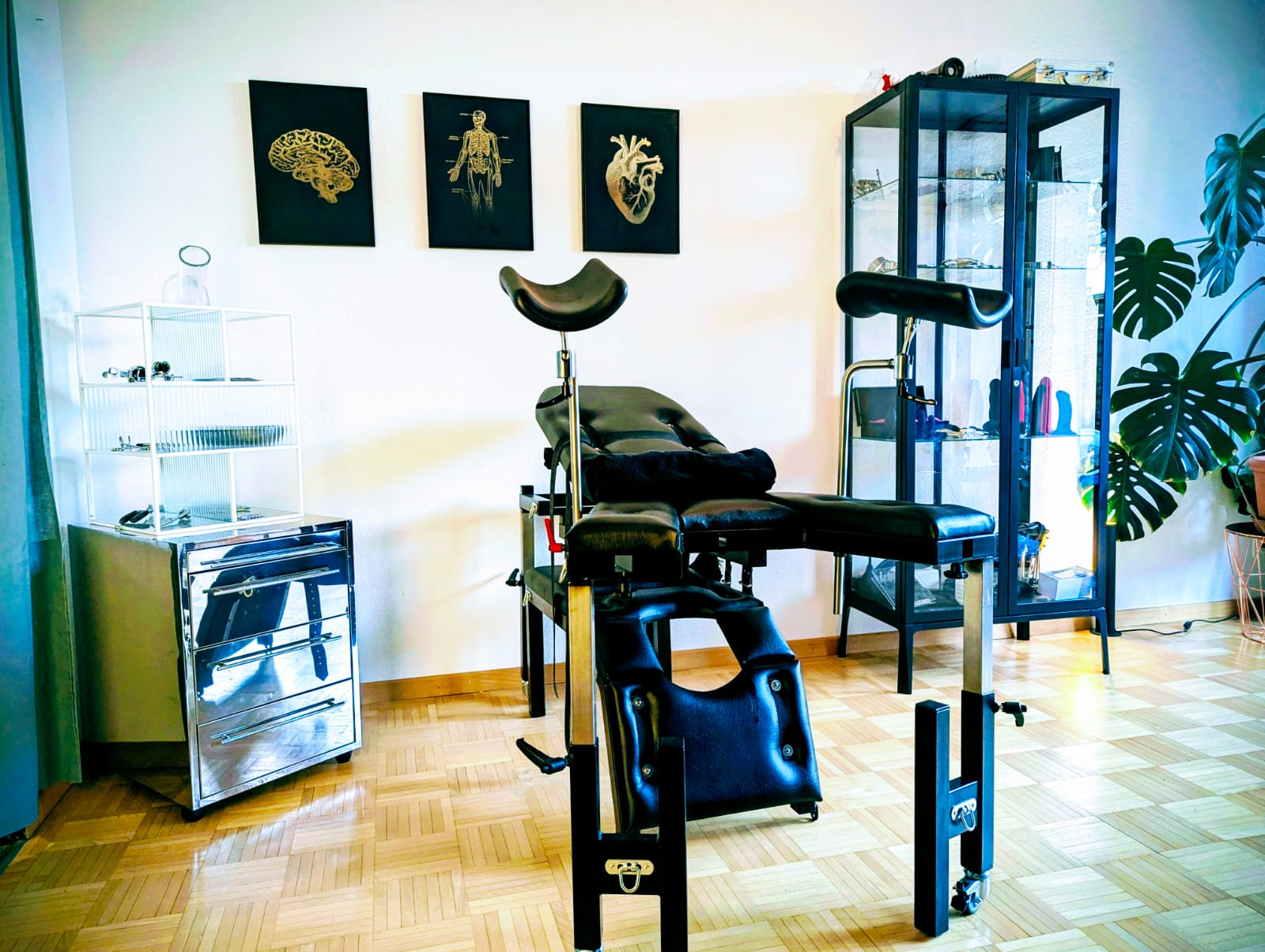 Dich erwartet ein geschmackvoll eingerichteter und gut ausgestattet Raum für BDSM Sessions. Ein sehr grosses Bett, Fixiermöglichkeiten für vertikales und senkrechte Spiele sowie eine Liege, Gynstuhl und Bock sind vorhanden. Eine wachsende Sammlung an hochwertigem Schlagwerkzeugen, KIinik Utensilien, Dildos, Latex und anderen Spielzeugen wird jeden BDSMler glücklich machen…